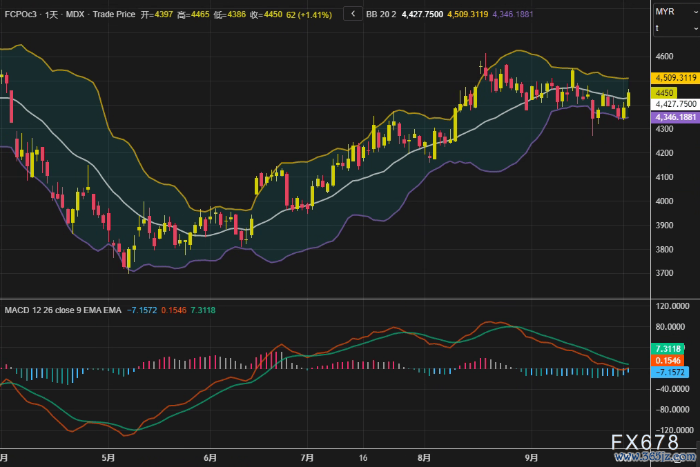 吉隆坡交往机构Iceberg X的自营交往员David Ng指出:“近期豆油阛阓的强势证据与出口数据的抓续改善,共同构筑了棕榈油价钱的支抓基础。咱们判断4400林吉特已成为关键技巧支抓位,而上方阻力则位于4550林吉特隔邻。”这一不雅点得回技巧主义印证,当今布林带中轨驱动于4509林吉特隔邻,MACD主义虽仍处于负值区间,但绿柱抓续收缩,清楚下降动能正在收缩。